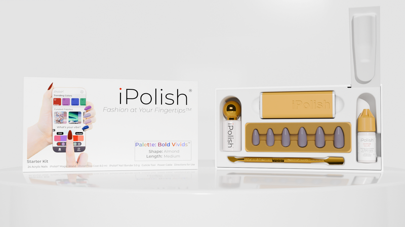 The iPolish® Medium Almond Starter Kit includes 24 standard press-on acrylic nails in sizes 0-11 to fit most fingernails (2 of each size), the iPolish® Magic Wand and USB-C cable, Directions for Use booklet, iPolish® Hyper Glue, iPolish® Quick Dry Clear Topcoat, dual-edge designer metal cuticle tool, mini file, acetone wipe, and a QR activation code. Each QR code is valid for 30 days on the iPolish® free mobile app.