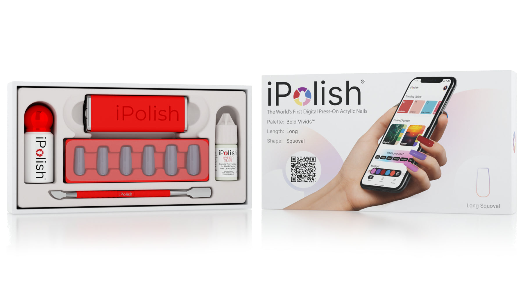 The iPolish® Long Squoval Starter Kit includes 24 standard press-on acrylic nails in sizes 0-11 to fit most fingernails (2 of each size), the iPolish® Magic Wand and USB-C cable, Directions for Use booklet, iPolish® Hyper Glue, iPolish® Quick Dry Clear Top Coat, dual-edge designer metal cuticle tool, mini buffer, acetone-free wipe, and a QR activation code.